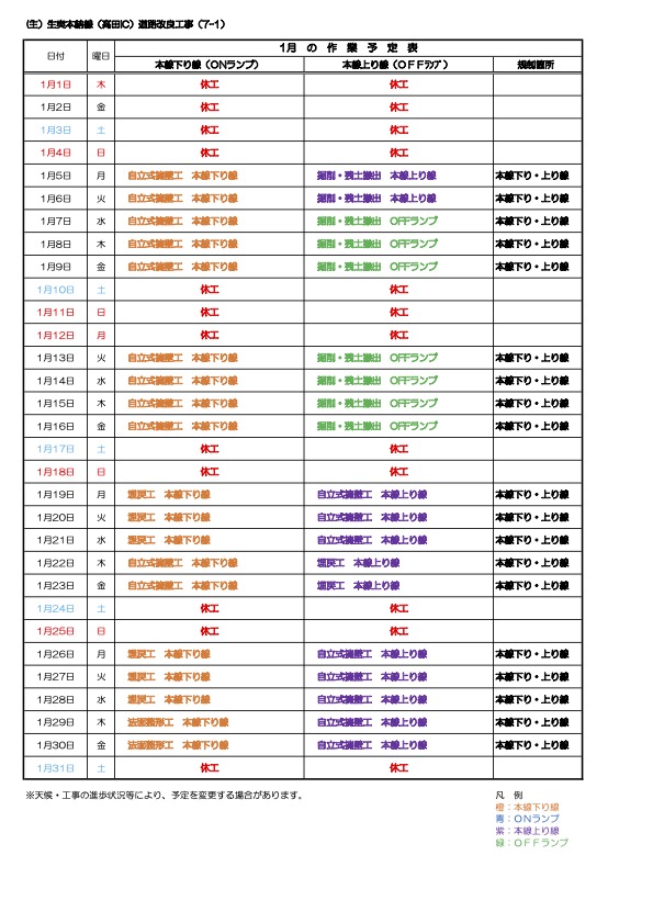 高田IC 1月の作業予定について
